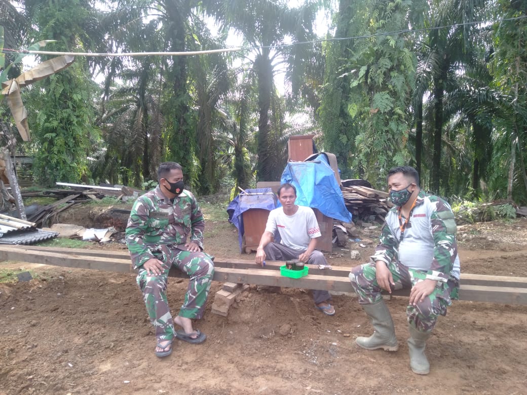 Merangin – Anggota Pra TMMD ke 111 TA 2021 Kodim 0420/Sarko melakukan pendekatan melalui bercengkrama sambil minum kopi bertempat di Lokasi Bedah rumah tidak Layak huni (RTLH) Milik Suprianto (37) di Dusun I Desa Bukit Beringin, Kecamatan Bangko Batat Kabupaten Merangin. Minggu (06/06/2021)
