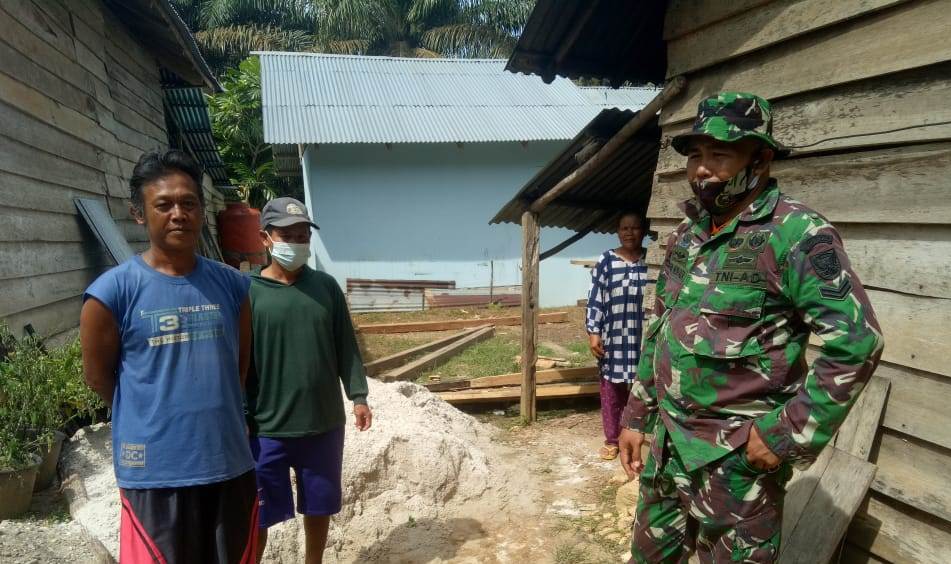 Merangin – Anggota Pra TMMD Ke 111 Kodim 0420/Sarko Sertu Ilman Hushada sedang mengecek rumah bapak Herman yang akan dikerjakan pada program RTLH (Rumah Tidak Layak Huni) di Dusun III Desa Bukit Beringin, Kecamatan Bangko Barat, Kabupaten Merangin, Rabu (02/06/2021).