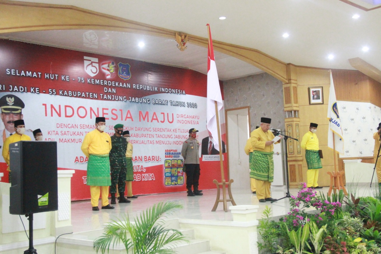 Tanjab Barat-, Bupati Tanjung Jabung Barat, Dr. Ir. H. Safrial MS pimpin langsung pelaksanaan Upacara Peringatan Hari Jadi Kabupaten Tanjung Jabung Barat ke-55 Tahun 2020 yang dilaksanakan di Balai Pertemuan Kantor Bupati. Senin (10/08/2020). Meskipun dilaksanakan dengan singkat dan dengan penerapan protokol kesehatan yang ketat, upacara tetap berjalan khidmat.
