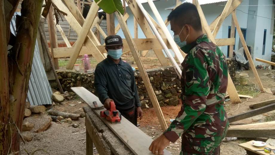 Merangin – Anggota Pra TNI Manunggal Membangun Desa (TMMD) Reguler Ke 111 Kodim 0420/Sarko TA.2021, Serda Rinaldo bersama Rahmat (50) mulai menyiapkan mengetam lisplang perehapan rumah tidak layak huni (RTLH) milik Herman(48).di dusun 4 RT 19 Desa Bukit Beringin Kecamatan Bangko Barat Kabupaten Merangin, Kamis (03/06/2021).
