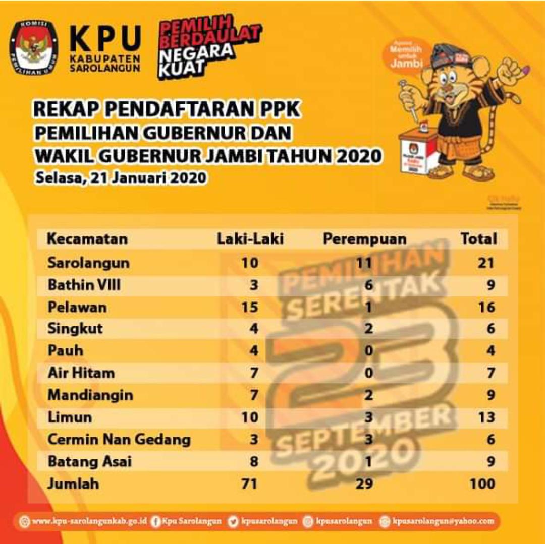 Tercatat dihari ke empat ada sekitar 51 peserta yang mendaftarkan diri sebagai calon PPK di 10 Kecamatan yang ada di Kabupaten Sarolangun, yang terdiri dari 42 peserta laki-laki dan 9 peserta perempuan. Jumlah itu sangat jauh meningkat jika dibandingkan hari hari sebelumnya, yang mana hari pertama hanya ada 4 peserta yang mendaftarkan diri.