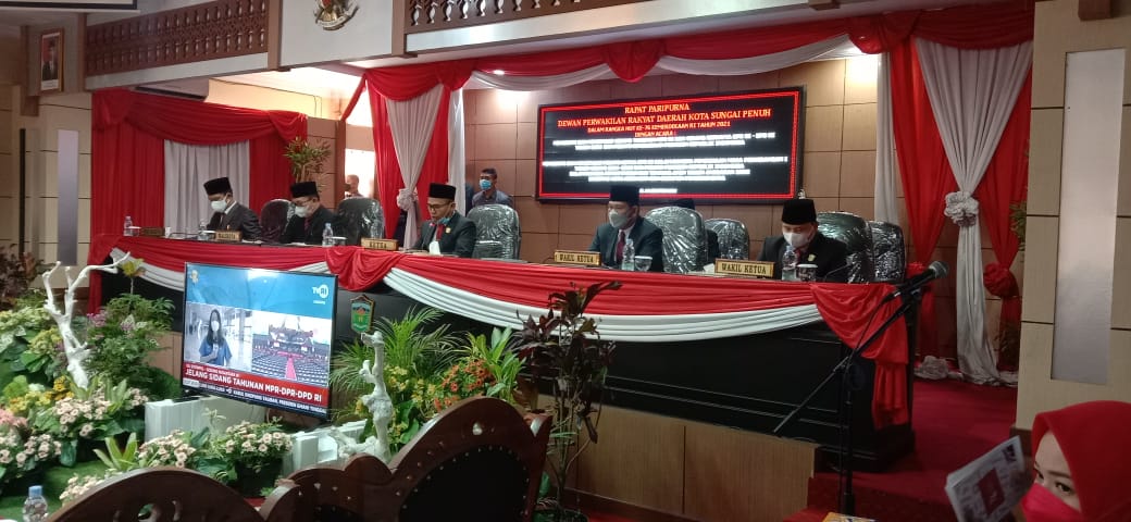 SUNGAI PENUH – Dewan Perwakilan Rakyat Daerah (DPRD) Kota Sungai Penuh menggelar Rapat Paripurna dengan agenda Mendengarkan Pidato Kenegaraan oleh Presiden RI Joko Widodo dalam rangka HUT ke-76 Kemerdekaan RI tahun 2021, di Ruang Paripurna DPRD, Senin (16/08).
