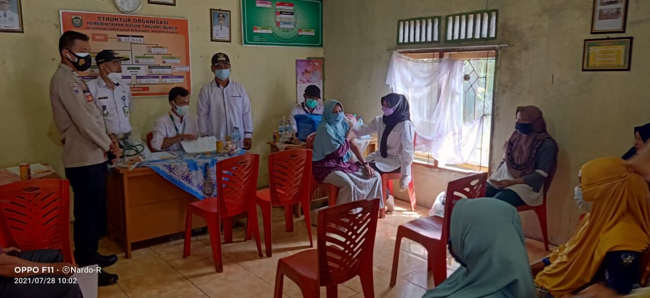 Muara Bungo – Disaksikan Camat, Babinkamtibmas, Ketua BPD dan Datuk Rio, Pemerintah Dusun Tanjung Bungo melakukan vaksinasi massal yang bertempat di Kantor Rio Dusun Tanjung Bungo, (28/7)
