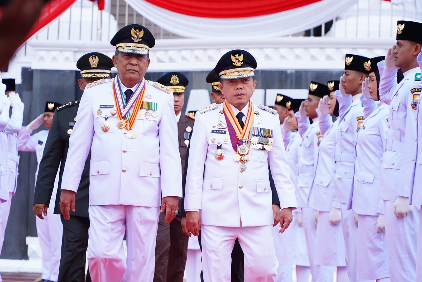 Jambi – Gubernur Jambi Al Haris beserta Wakil Gubernur Jambi Abdullah Sani, beserta pejabat pemerintah Provinsi Jambi dan Forkompinda, Sabtu (17/8) sore ,kembali hadir di lapangan kantor Gubernur untuk melaksanakan Upacara penurunan Bendera Peringatan ke-79 Hari Proklamasi Kemerdekaan RI. Danrem 042/Garuda Putih Brigjen TNI Rachmad dipercayakan sebagai Irup penurunan bendera. Tampak hadir pula di tempat tersebut, Sekda Provinsi Jambi, Sudirman, Ketua TP-PKK Provinsi Jambi, Hj.Hesti Haris, dan Ketua organisasi Wanita lainnya,juga peserta upacara yang diantaranya berasal dari TNI/Polri, ASN, Mahasiswa dan Pelajar.