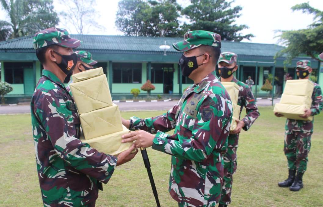 Merangin – Komandan Kodim (Dandim) 0420/Sarko Letkol Inf Tomi Radya Diansyah Lubis, S.A.P., M.Han. menyerahkan secara simbolis bingkisan tunjangan hari raya (THR) Idul Fitri 1442 H bagi anggota Prajurit dan PNS di lapangan apel Makodim 0420/Sarko Jl. Lintas Sumatera KM 3,5 Lingkungan Mensawang Keluarahan Dusun Bangko Kecamatan Bangko Kabupaten Merangin. Kamis (07/05/2021).
