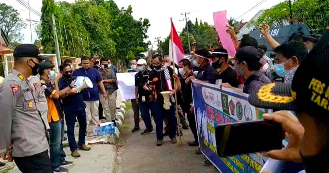 Muara Bungo – Puluhan wartawan di Bungo datangi Mapolres Bungo. Mereka menuntut dan meminta kepada pihak kepolisian untuk mengusut kasus pengeroyokan terhadap dua rekannya yang terjadi pada hari Sabtu tanggal 29 Mei 2021 di SPBU Jalan Lingkar Sei Buluh Kecamatan Rimbo Tengah Kabupaten Bungo.
