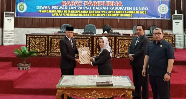 Muara Bungo – Bertempat di Aula Paripurna DPRD Kabupaten Bungo digelarnya rapat paripurna penandatanganan nota kesepakatan Kebijakan Umum Anggaran dan Prioritas Plafon Anggaran Sementara (KUA PPAS) APBD Perubahan Tahun Anggaran 2019 yang kini pada fase finalisasi (25/11).