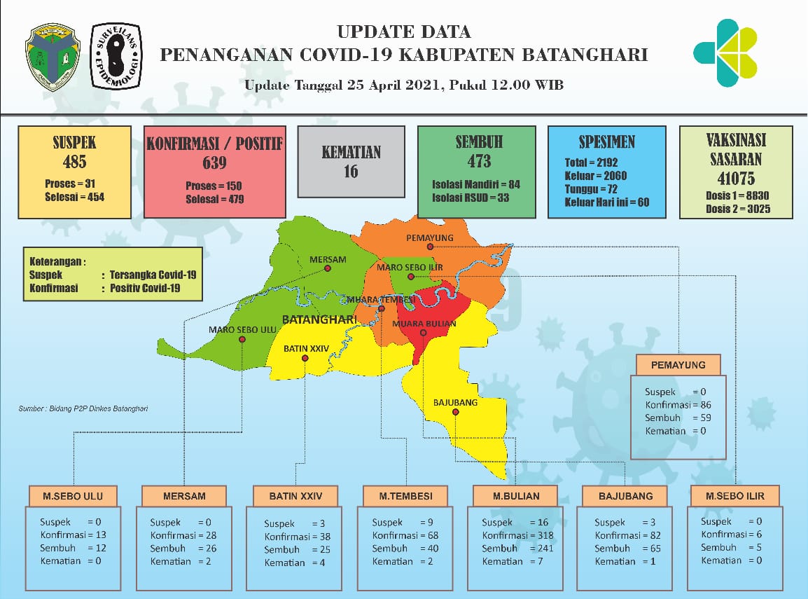 Dan berikut perkembangan situasi terkait penanganan Covid-19 di Kabupaten Batanghari 25 April 2021 s/d 12.00 wib sbb: