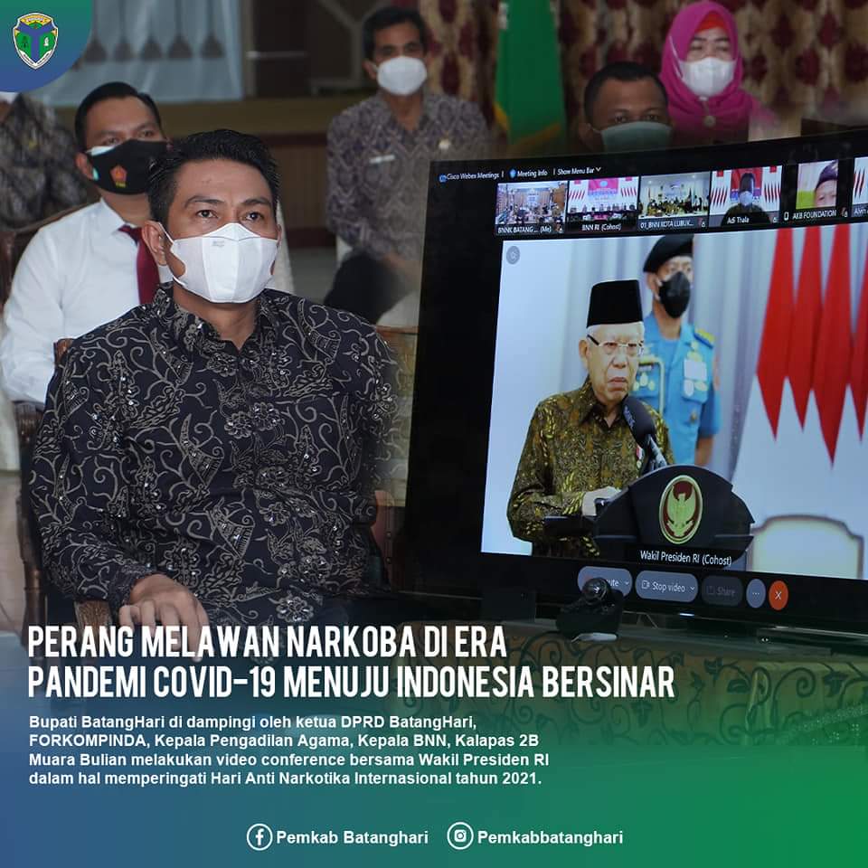 Batanghari – Bupati Batang Hari di dampingi oleh ketua DPRD Batang Hari, Forkopimda, Kepala Pengadilan Agama, Kepala BNN, Kalapas 2 B Muara Bulian ikuti video conference bersama Wakil Presiden Republik Indonesia (RI) dalam Rangka Puncak Acara Hari Anti Narkotika Internasional (HANI) tahun 2021, di ruang Kaca Rumah Dinas Bupati Batanghari, Senin, (28/6/2021).