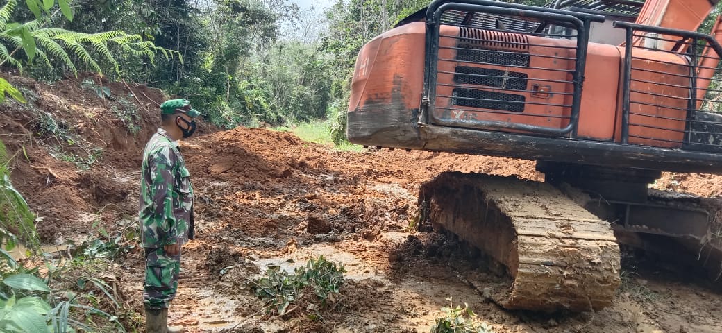 Merangin – Sasaran fisik di Pra TMMD Ke 111 Kodim 0420/Sarko yaitu peningkatan jalan yang menghubungkan Desa Bukit Beringin Kecamatan Bangko Barat dengan Desa Beringin Sanggul Kecamatan Tiang Pumpung Kabupaten Merangin Jambi saat ini fokus pada penimbunan badan jalan, Senin (07/06/2021).