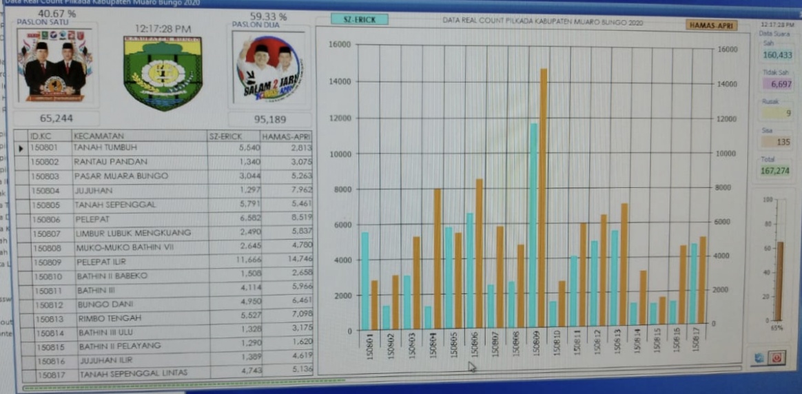 “Hasil penghitungan kita dari data C1 rekap 780 dari 799 TPS se Bungo, total suara sah sebesar 160.433 suara, yang tidak menggunakan hak pilih cukup tinggi, lebih kurang di angka 29,3 persen,” ungkap Dirut Media Center Hamas-Apri, Fauzi. Kamis (10/12/2020).