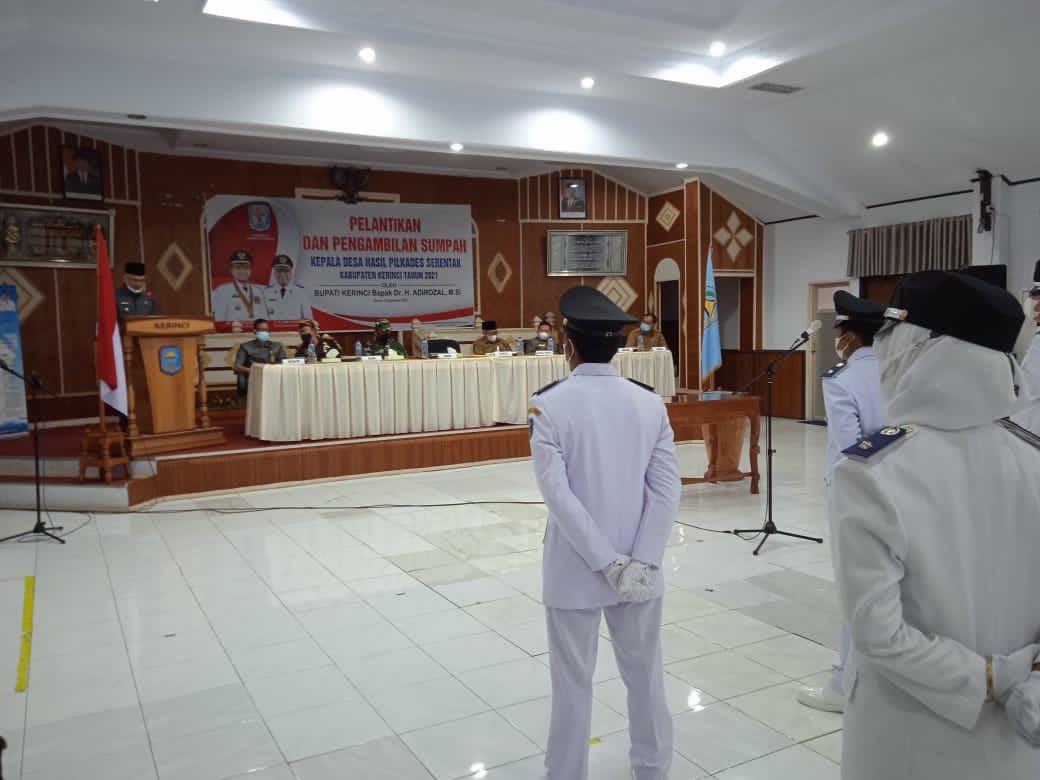 Kerinci – Bupati Kerinci Adirozal melantik dan mengambil sumpah sebanyak 150 kepala desa terpilih 2021.