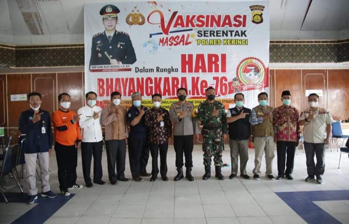 Polres Kerinci melaksanakan bhakti kesehatan serentak dengan menggelar kegiatan vaksinasi massal yang bertempat di gedung nasional Sungai Penuh.