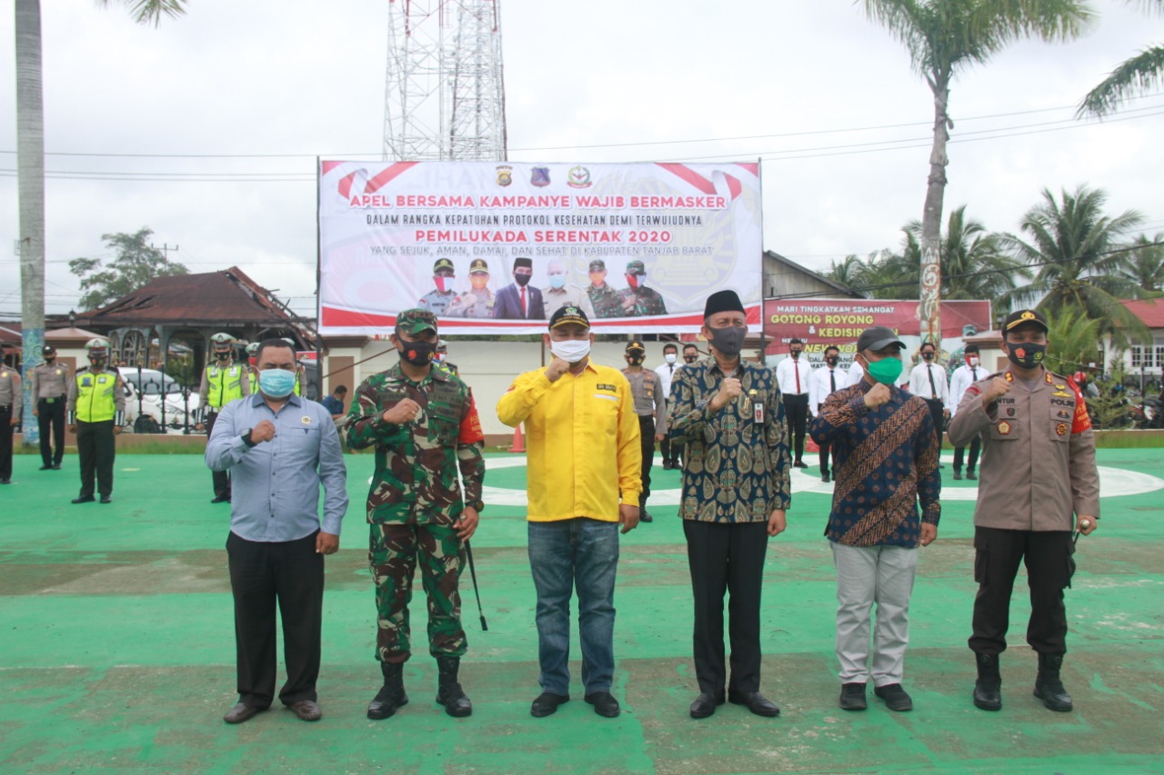 Tanjab Barat-,Sekda Ir. H. Agus Sanusi MS,I ikuti Apel bersama kampanye wajib bermasker dalam rangka kepatuhan Protokol Kesehatan guna mewujudkan Pemilukada serentak 2020 yang sejuk, aman,damai dan sehat di Kabupaten Tanjung Jabung Barat. Kamis (10/09/2020).
