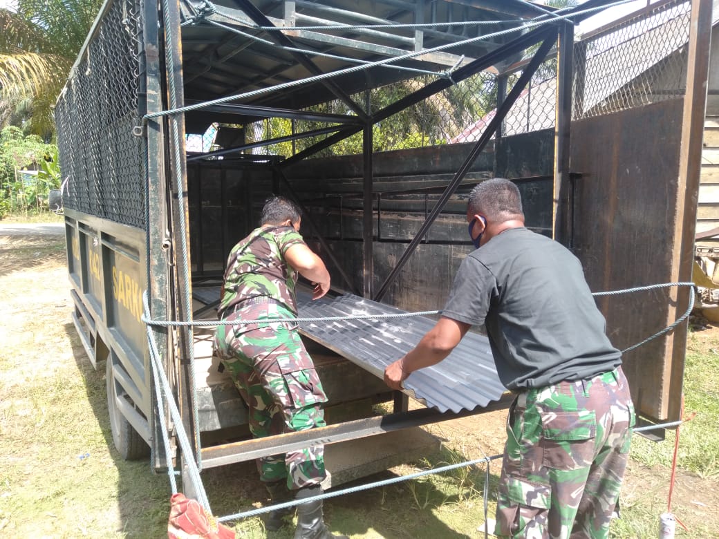Merangin – Satgas Pra TMMD ke 111 Kodim 0420/Sarko Serda Abral Saleh dan Kopda Edi Gunawan anggota Staf Logistik Kodim 0420/Sarko menyuplai matreal atap seng untuk renovasi rumah pak Herman di Dusun IV Desa Bukit Beringin Kecamatan Bangko Barat Kabupaten Merangin Jambi, Jum’at (11/06/21)