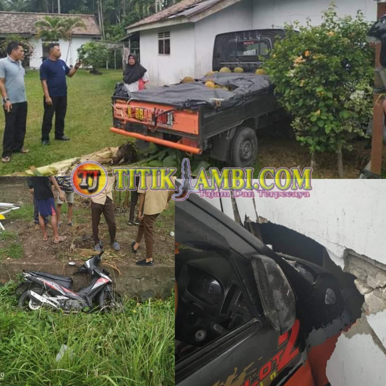 Sehinga kendaraan terseret keluar dari badan jalan hingga masuk ke parit dan setelah itu kendaraan pick up daihatsu gran max BH 8029 MO menabrak rumah milik Ibu Kiptia.