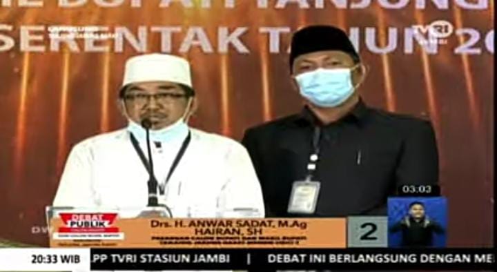 Tanjab Barat-, Untuk membuat perubahan yang besar dimulai dari diri sendiri dan menonjolkan sikap jujur, hal ini diungkapkan Pasangan calon Bupati dan Calon wakil bupati nomor urut dua yang diusung partai politik PAN, Gerindra, Dan PKS. Drs.H.Anwar Sadat, M.ag dan Hairan, SH. Yang akan bertarung pada tanggal 09 Desember 2020 mendatang saat sesi closing statement, debat kandidat yang di selenggarakan Komisi Pemilihan Umum (KPU) Kabupaten Tanjung Jabung Barat rabu malam (25/11/2020) di gedung pola kantor bupati Tanjung Jabung Barat.