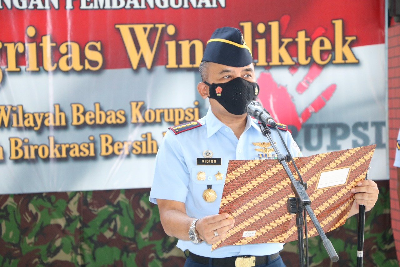 TNI AU Kalijati – Komandan Wing Pendidikan Teknik (Danwingdiktek) Kolonel Tek Videon Nugroho S., S.T., M.Han,. memimpin acara pencanangan pembangunan Zona Integritas untuk mewujudkan Wilayah Bebas Korupsi (WBK) dan Wilayah Birokrasi Bersih dan Melayani (WBBM) Wingdiktek, kegiatan di laksanakan di Hanggar Skadik 303 Wingdiktek, Kalijati. Rabu (20/4).
